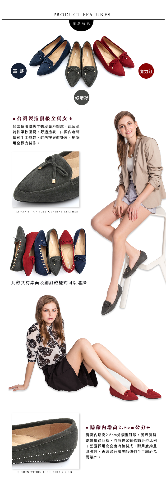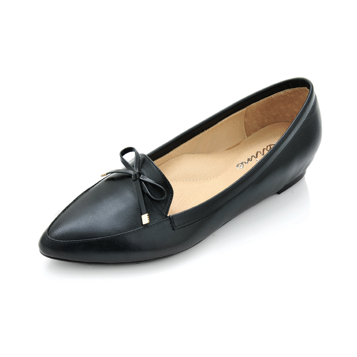 karine(MIT台灣製)全真皮尖頭蝴蝶結內增高楔型鞋-原皮黑色