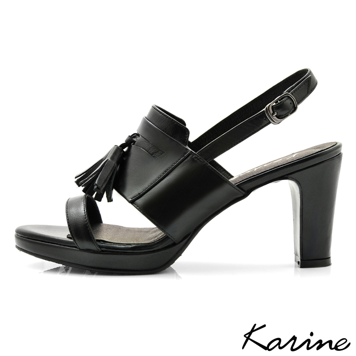 karine(MIT台灣製)全真皮一字帶流蘇高跟涼鞋-黑色